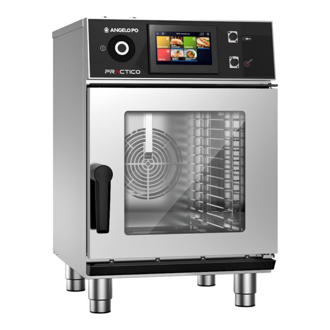 Kombine konveksiyon/buhar fırını. AISI 304 paslanmaz çelikten pişirme haznesine sahip paslanmaz çelikten yapılmış yapı. AISI 304 paslanmaz çelik çubuktan çok raylı konteyner rafı. Kontrollü ve modüle edilmiş aşırı basınç ortamında anında buhar üretimi. Kapasitif dokunmatik ekranlı, 7″ yüksek çözünürlüklü LCD arayüzlü, kaydırma fonksiyonlu kontrol paneli. Programlanabilir (300 program – 18’e kadar ardışık pişirme aşaması). Manuel, otomatik veya hafızaya alınmış pişirme işlemleri. Önceden ayarlanmış özel işlemler: Bekletme, Delta T, Rejenerasyon, Düşük Sıcaklık, Kavanozlarda Pastörizasyon ve Kavanozda pişirme (aksesuarla), Tütsüleme, Vakumlu paketleme, Kurutma ve Tütsüleme (aksesuarla). Otomatik pişirme haznesi yıkama sistemi. 5 sensörlü çok noktalı çekirdek probu sağlanır. APO.LINK portalına standart olarak bağlanabilir. Pişirme programlarının, yazılım güncellemelerinin, HACCP verilerinin, fırın yedeklemesinin, görüntülerin indirilmesi/yüklenmesi için USB portu. Kapı soldan sağa açılır.