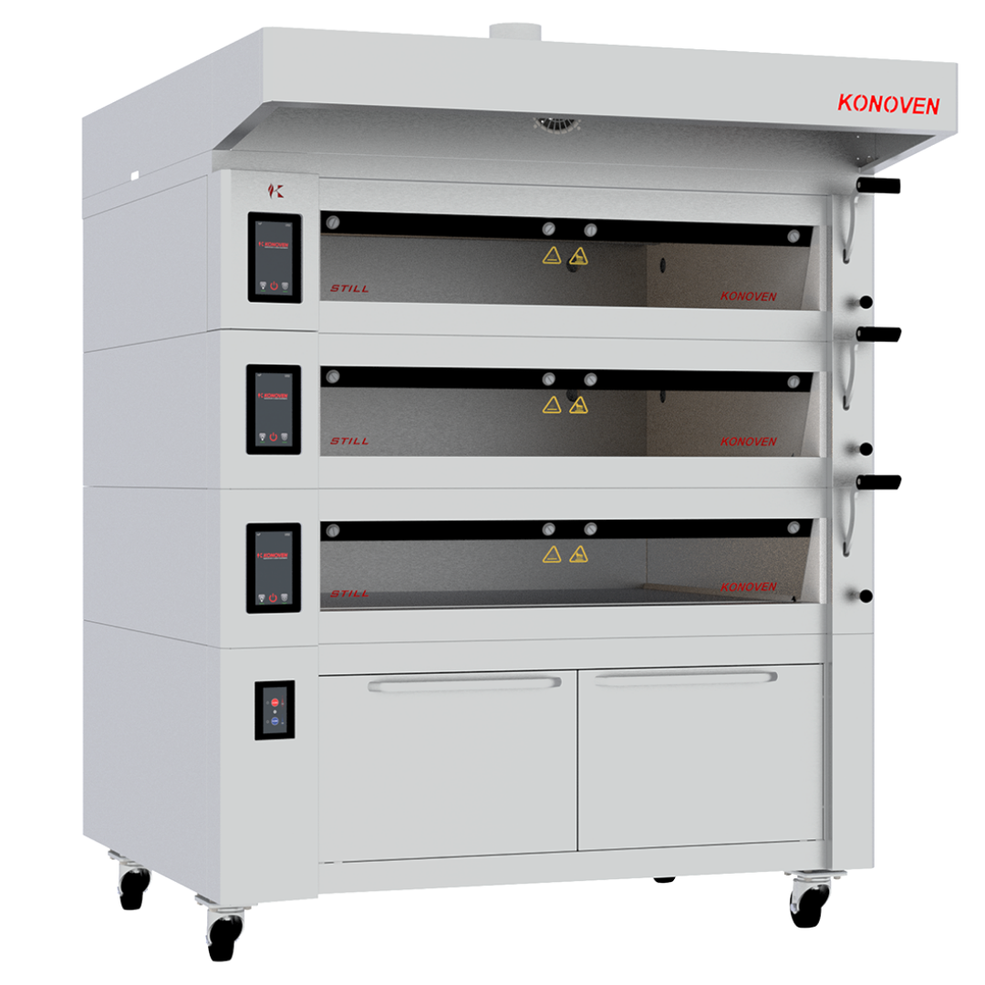 • Elektrik ısıtmalı, taş tabanlı, çok katlı fırın, her kat için bağımsız ısı ve buhar kontrolü.